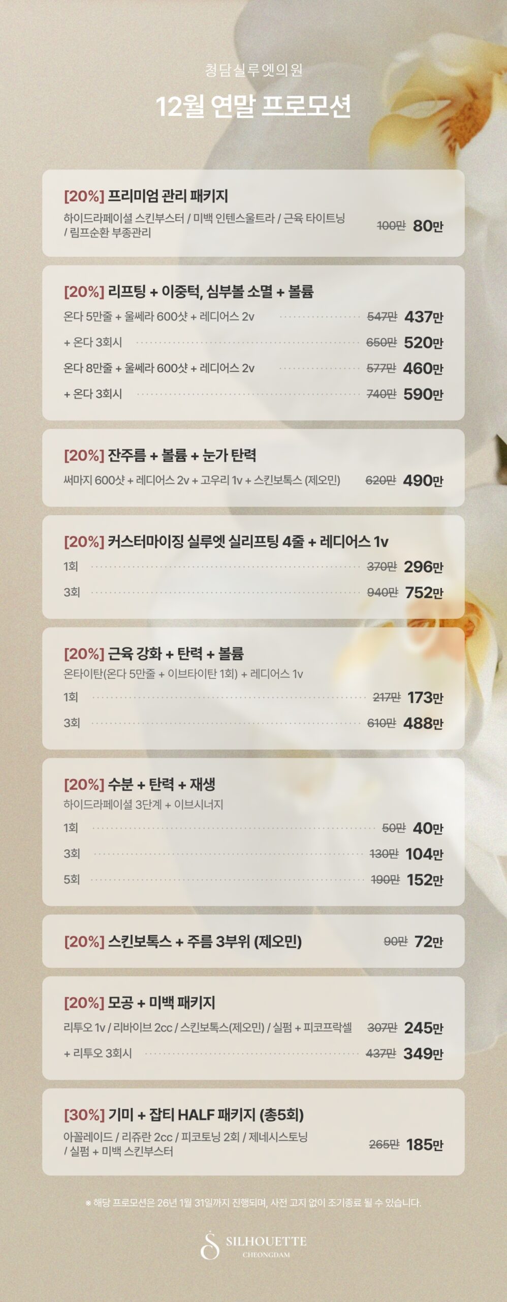 Home » Event » 청담실루엣의원 12~1월 연말 프로모션 청담실루엣의원 12~1월 연말 프로모션 by 청담실루엣의원 Clinic Hours 월, 화요일오전 10:00 ~ 오후 7:00 수, 금요일오전 10:00 ~ 오후 8:30 토요일오전 10:00 ~ 오후 3:00 점심시간오후 1:00 ~ 오후 2:00 - 토요일은 점심시간 없이 진료합니다. - 매주 목요일, 일요일, 공휴일은 휴진입니다. 전화 상담 카카오톡 상담 청담실루엣의원 12~1월 연말 프로모션 관련 아티클 추천 시술